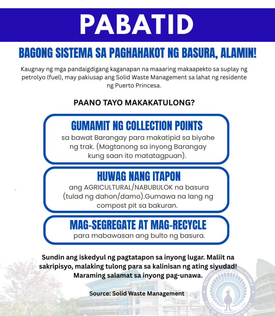 Sa layuning mas mapabuti ang serbisyo at makatipid sa operasyon, hinihikayat ng Solid Waste Management ang pakikiisa ng bawat residente sa mas maayos at mas episyenteng sistema ng paghakot ng basura sa lungsod.
