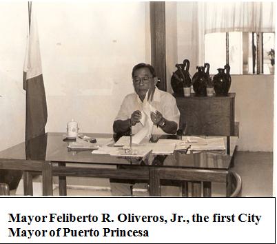 Feliberto Rodriguez Oliveros, Jr. was duly elected Municipal Mayor of Puerto Princesa on January 1, 1968. But his services as Municipal Mayor were interrupted on December 31, 1969, when the Municipality of Puerto Princesa was converted into a component City on January 1, 1970. He continued to serve as the First City Mayor of Puerto Princesa until March 2, 1986, after the Presidential Snap Election on January 7, 1986. Feliberto R. Oliveros, Jr. was born on November 17, 1937 in Manila. His parents were Feliberto Oliveros of Cuyo and Leonila Rodriguez of Coron, Palawan. He married Rafaelita Silano. They have two sons Victor and Feliberto III, a Councilor of the City of Puerto Princesa.